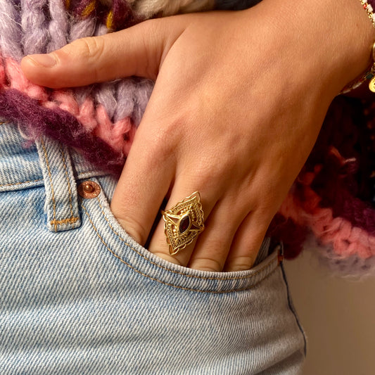14k Gold Vermeil Oval Ethnic Garnet Ring 16 mm Limited Edition