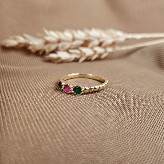 14K Gold Vermeil Amora Charm Ring Synthetic Ruby, and Emerald