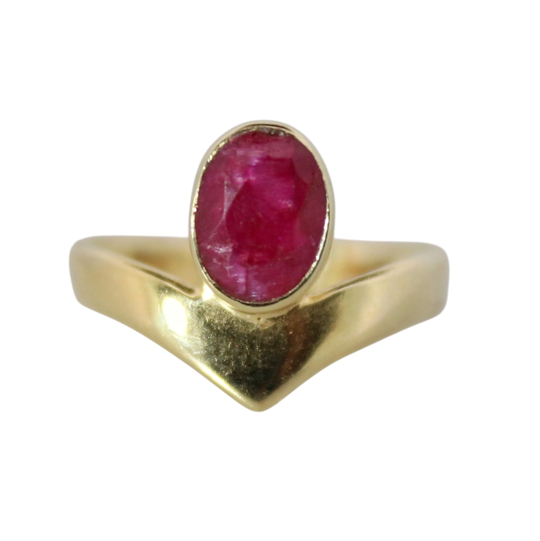 Handgemaakte afgerond rechthoekige ring met curve waar een ovale edelsteen in geplaatst is in een open zetting.