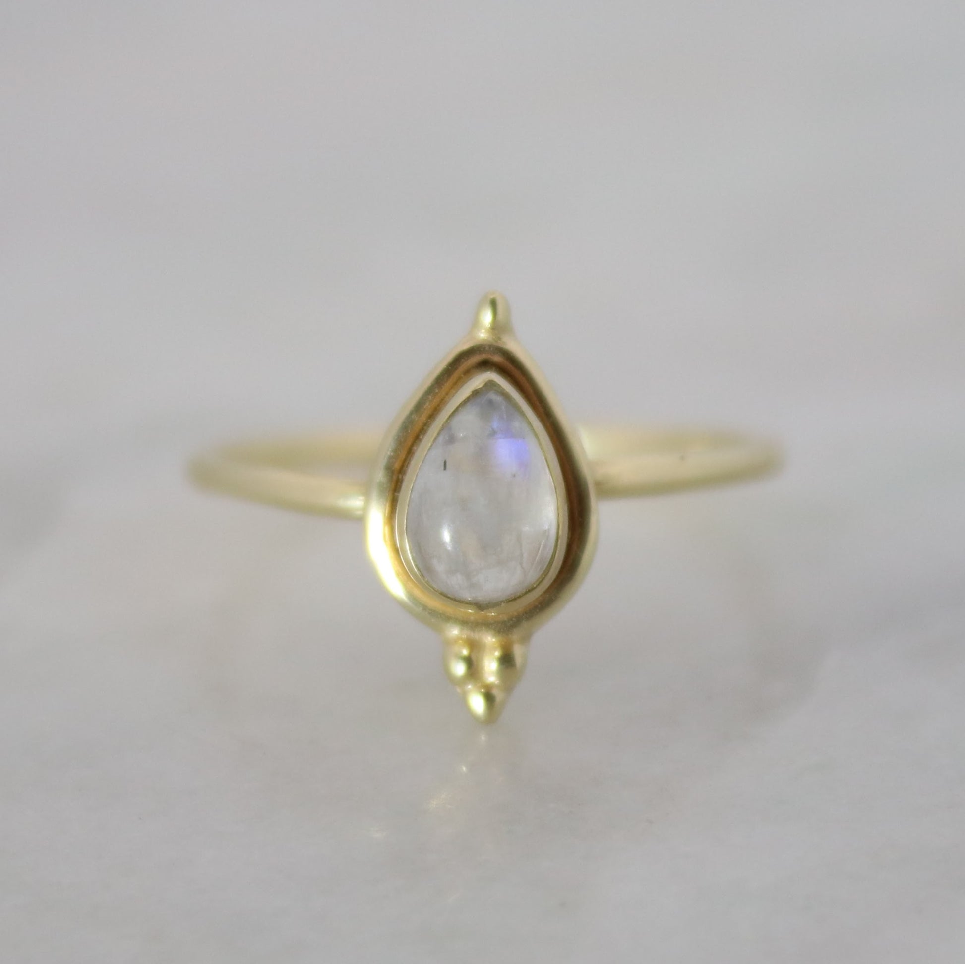 Handgemaakte ronde ring met druppelvormige edelsteen in een open zetting met boven een enkele druppel en onderin drie druppels.